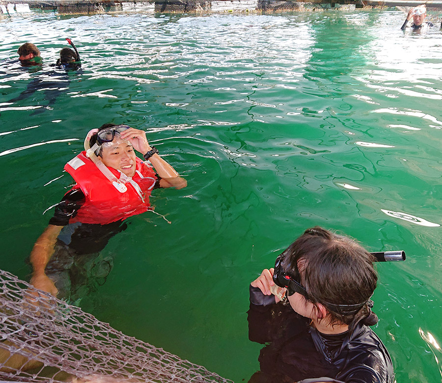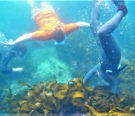 伊勢志摩ツーリズムのツアーでは、ウェットスーツを着て、地元の海女さんと一緒に海に飛び込みます。アワビ、サザエ(リュウテンサザエ)、その他の海の珍味を目の前でダイビングします。